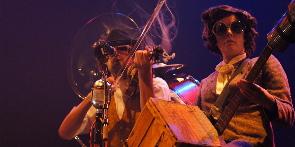 The world of Tom Waits opens up like an apple sliced with a sharp knife when a madcap multi-instrumental orchestra performs his songs with found objects and invented instruments. Off-the-rail tableaux vivants come to life. The musicians play in front of each other, on top of each other, switching voices, putting their feet in their mouth, spokes in their wheels, ropes around their necks.